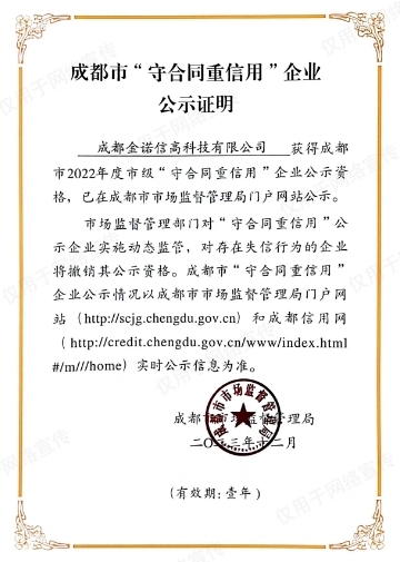 近日,成都市市場監(jiān)督管理局發(fā)布了2022年度“守合同重信用企業(yè)”公示名單,金諾信憑借完善的誠信建設體系與良好的合同管理水平榮登榜單。