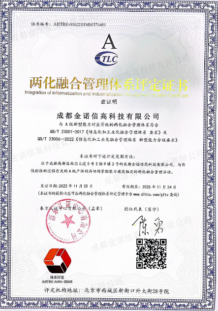 成都金諾信高科技有限公司成功獲得《兩化融合管理體系評定證書》,這標(biāo)志著我司在推進(jìn)工業(yè)化和信息化融合方...
